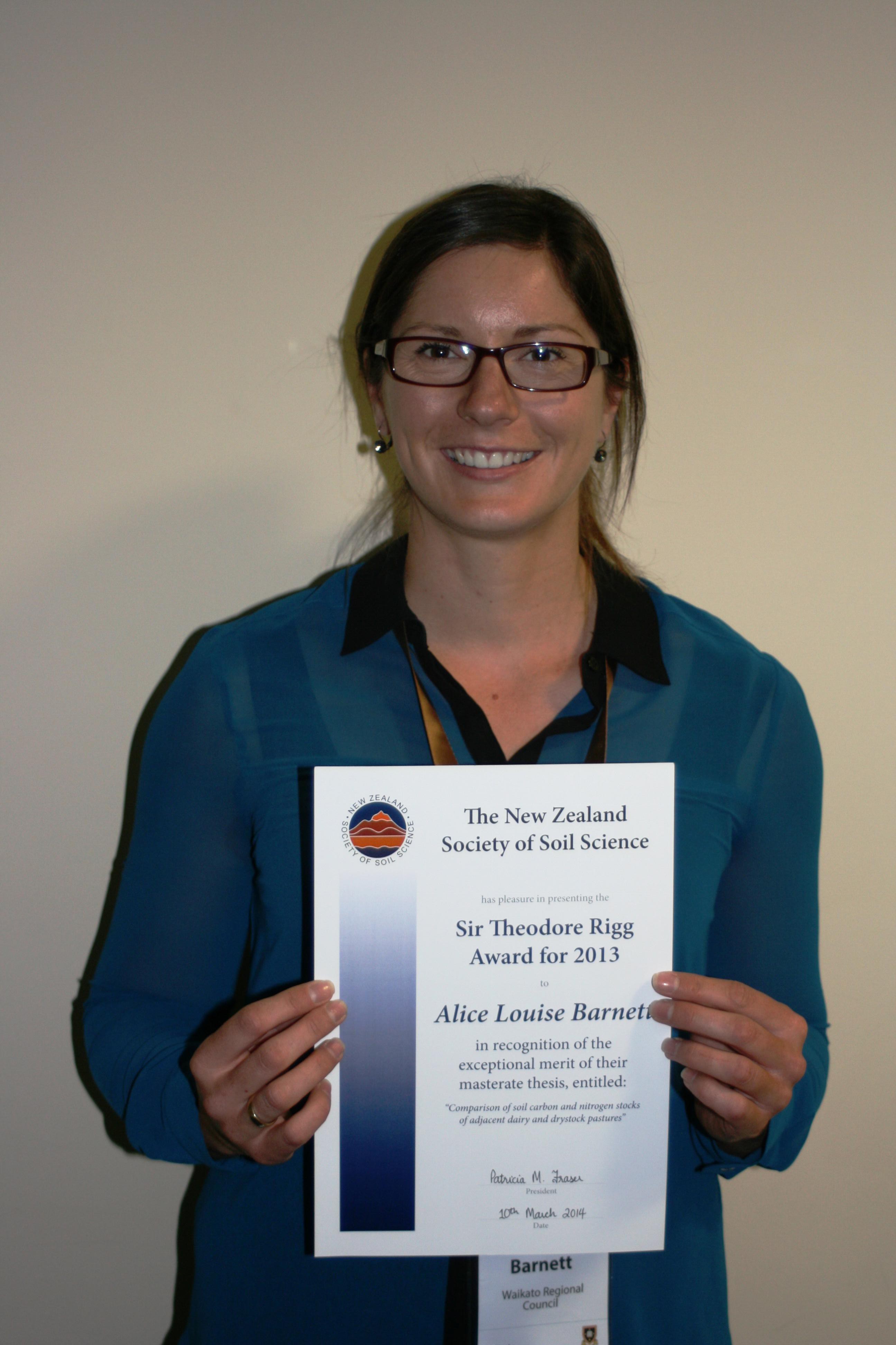 Alice Barnett won Sir Theodore Rigg award for best MSc Thesis of 2013 from the New Zealand Society of Soil Science. Awarded at the conference dinner.