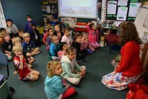 Louis and Angela donate copies of “Sam and Dave Dig a Hole” to primary schools in Hamilton. Note the kids in the background holding a soil auger.