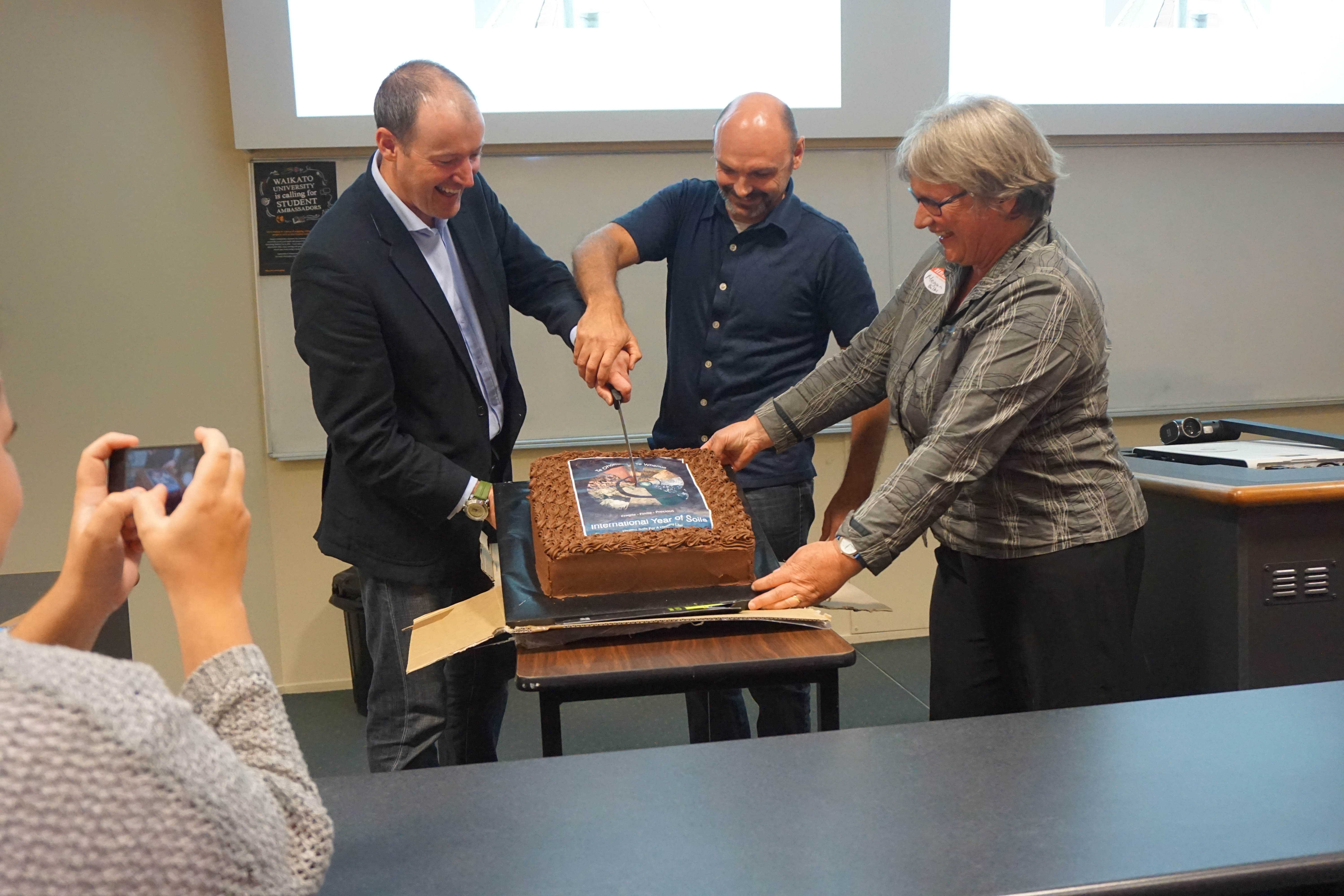The 5th December was celebrated at the WaiBoP workshop with the cutting of a cake, from left Richard McDowell (Norman Taylor lecturer 2015), Reece Hill and Megan Balks.
