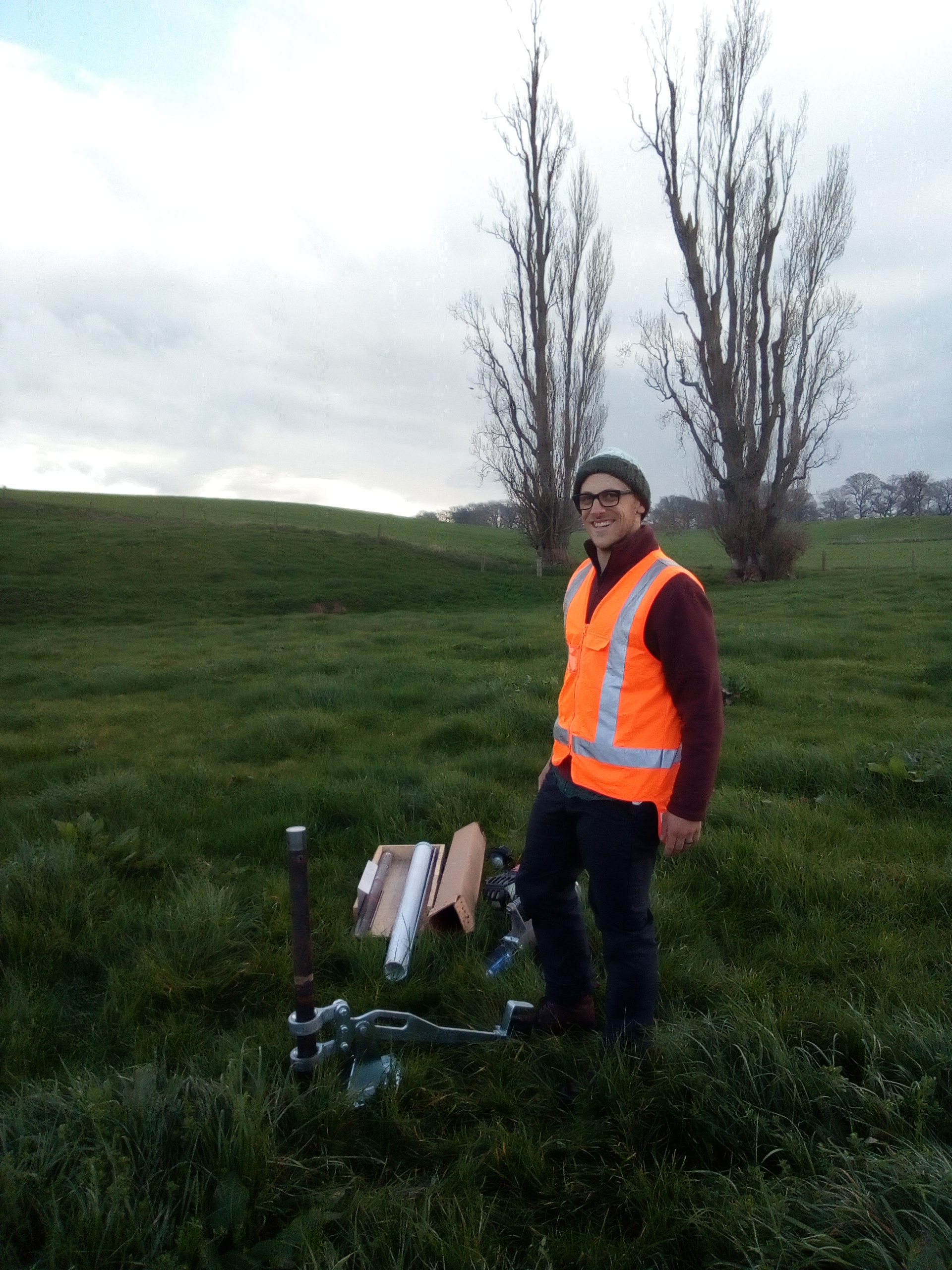 Shane visited from Max Planck Institute for Biogeochemistry where he is conducting his PhD with Prof Susan Trumbore. He came to sub-sample soils from the Winchmore long-term pasture grazing trial for subsequent measurement of bomb carbon. Pictured here he is assisting with soil sampling with Matt House (MSc student).