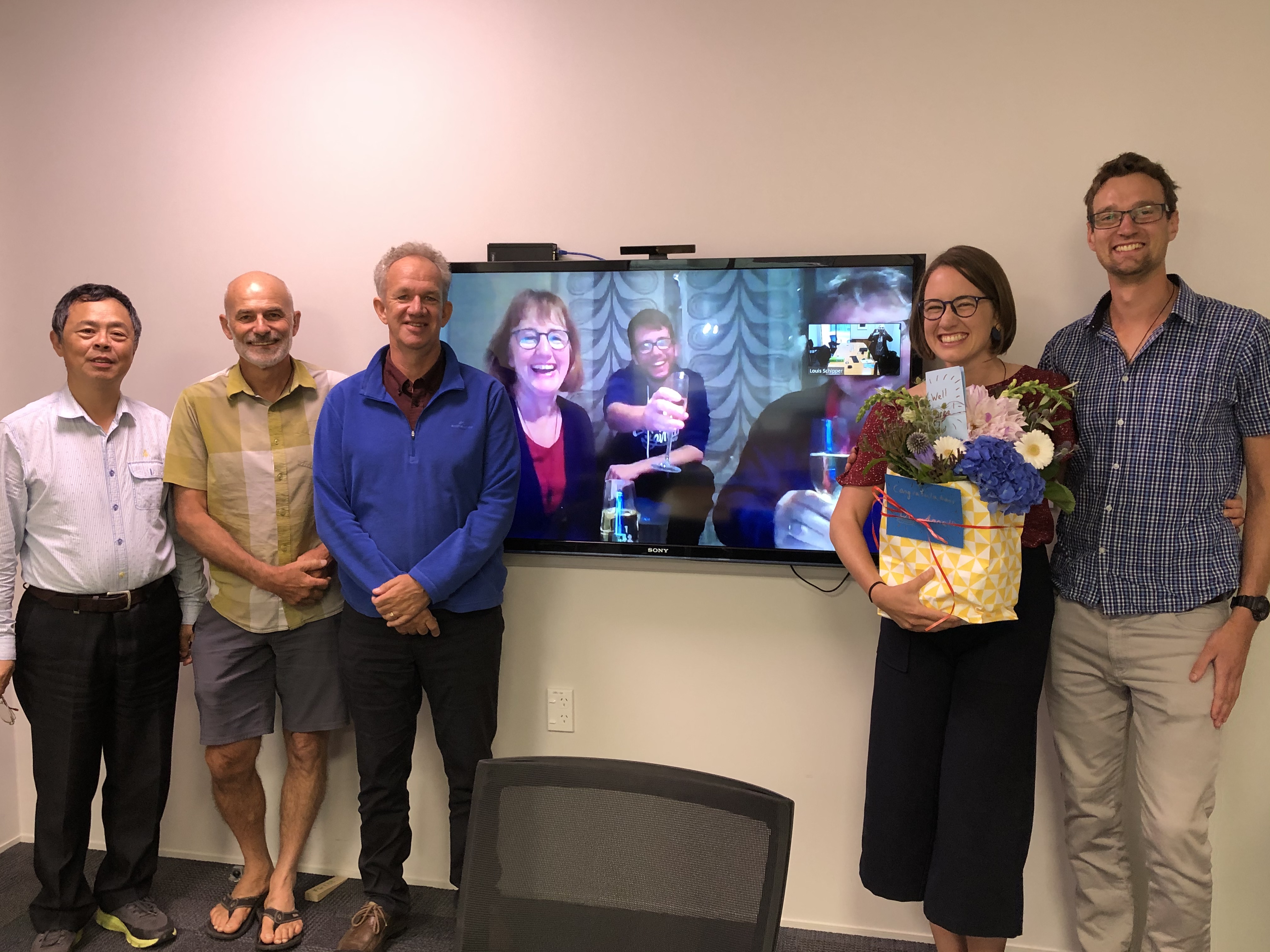 Today we celebrated Dr Anne Wecking’s successful PhD oral exam. Big congratulations. Pictured are supervisors on left, Anne’s family beaming in from Germany in the middle and Anne with partner Tom on right.